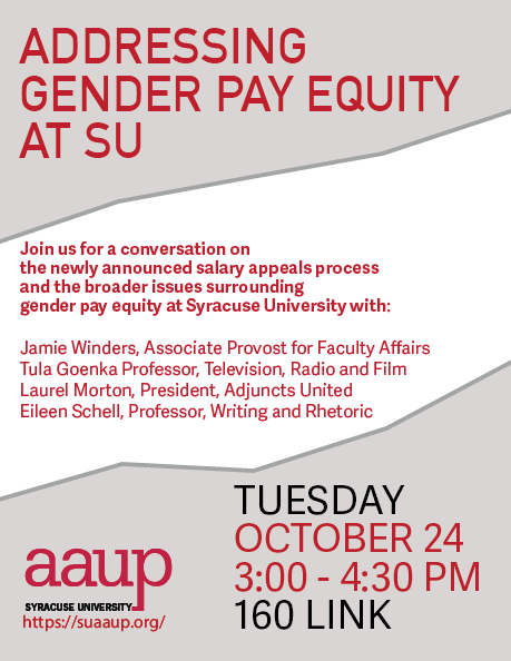 ADDRESSING GENDER PAY EQUITY AT SU October 24: 3-4:40 PM, 160 Link Hall Share this: Click to share on X (Opens in new window) X Click to share on Facebook (Opens in new window) Facebook Like Loading... Related